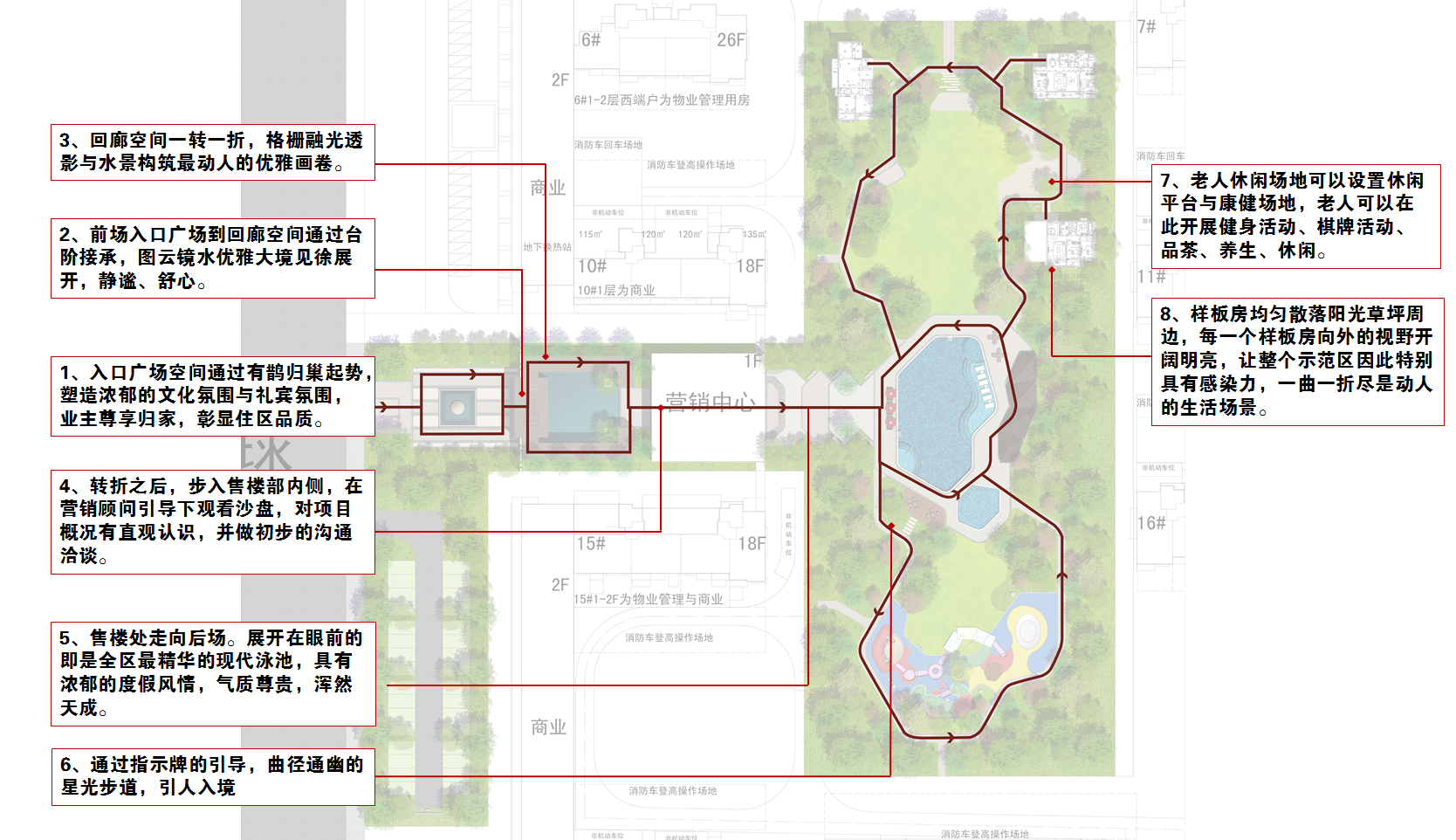 星光步道——曲徑通幽,兩側林蔭成趣,芳草鮮美,落英繽紛,自然引導客戶沿著精心設計的游線進入下一個雅趣空間。