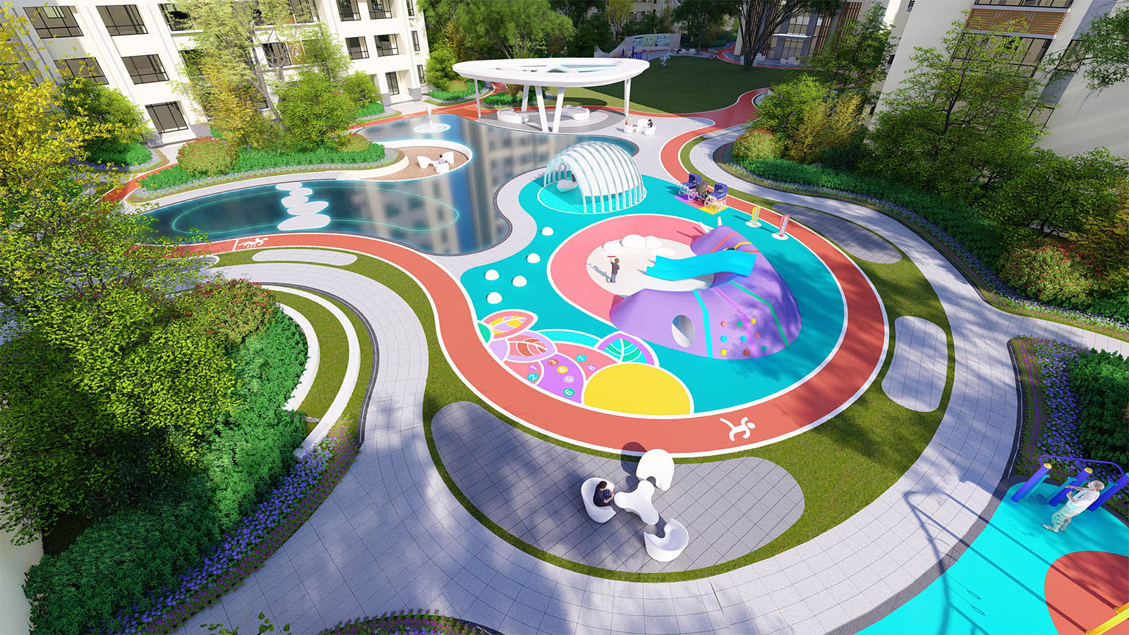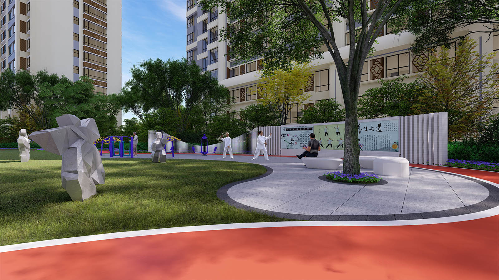 太極健身區(qū)設(shè)計(jì)太極點(diǎn)位,方便老人展開(kāi)太極運(yùn)動(dòng),特別為老人設(shè)計(jì)了棋牌娛樂(lè)空間,方便鄰里間在茶語(yǔ)飯后休閑時(shí)間,切磋棋牌游戲