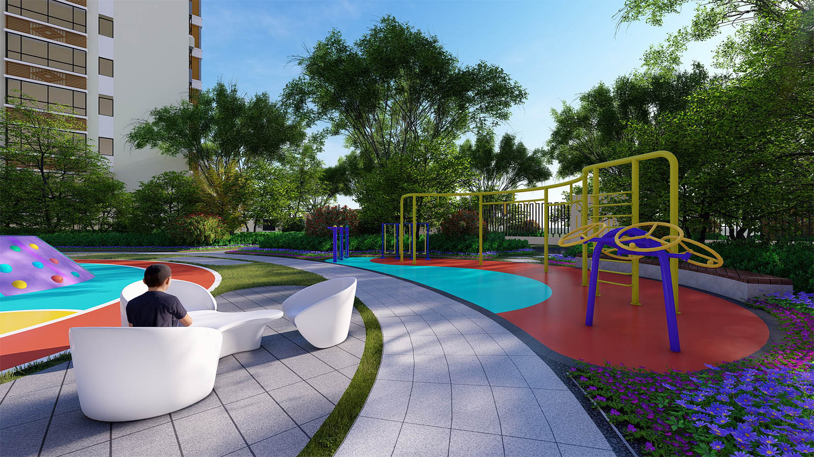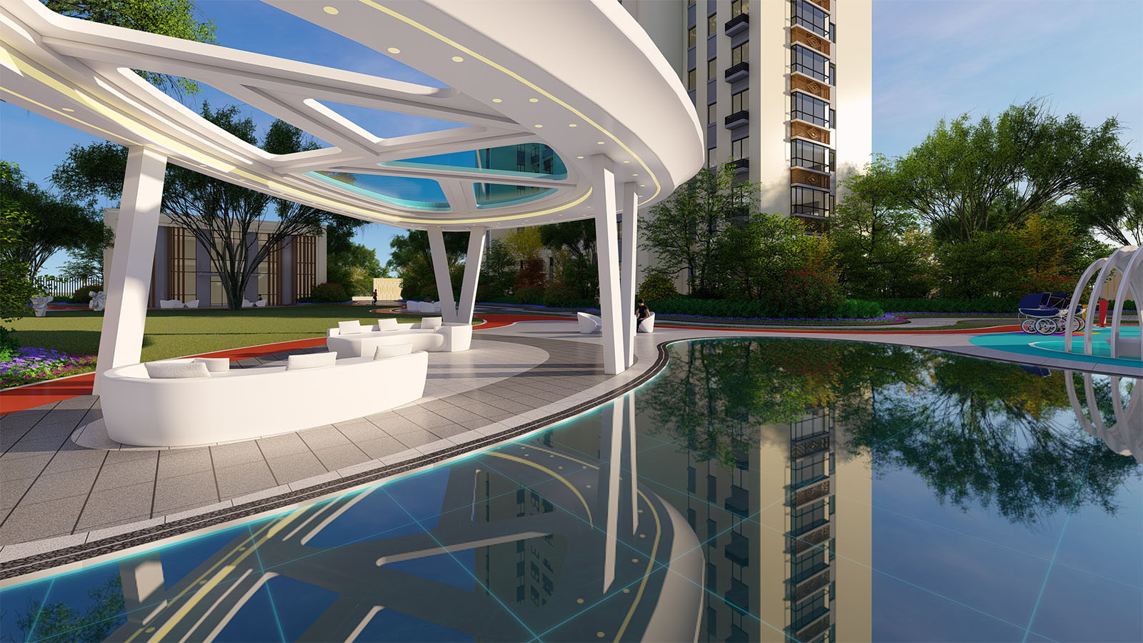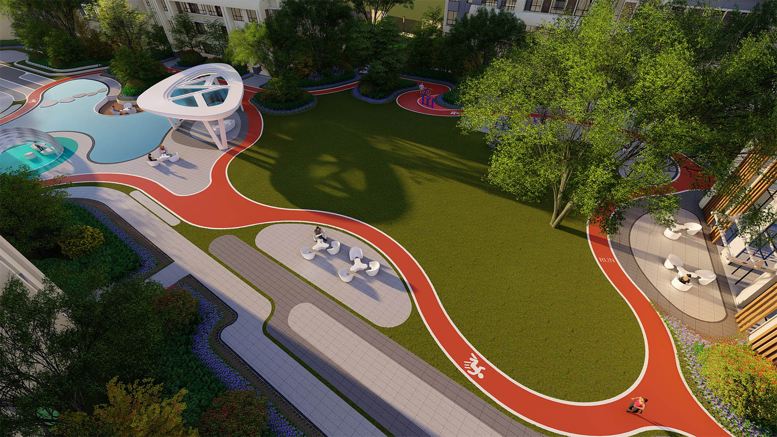 通過(guò)柔美曼妙的曲線環(huán)繞形成一片溫馨、和煦、柔軟的開(kāi)敞空間,陽(yáng)光兼具詩(shī)意,草坪如綠毯般輕柔展開(kāi),自然優(yōu)雅,