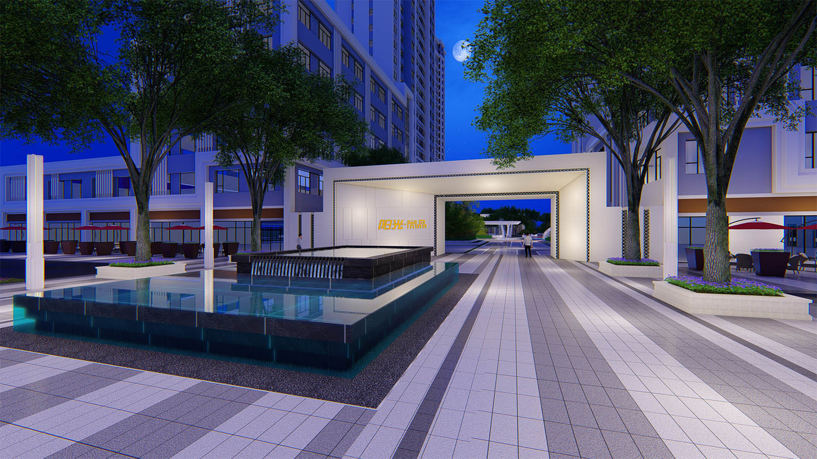 主入口重新梳理原有的商業(yè)車行交通動(dòng)線,通過(guò)林蔭樹(shù)陣及景觀燈柱的布置,隔離車行動(dòng)線,并引導(dǎo)車流由南北兩處車行入口進(jìn)入,入口廣場(chǎng)采用簡(jiǎn)雅的設(shè)計(jì)手法,保證人行動(dòng)線安全、流暢,布置鏡面疊水水景,結(jié)合景觀樹(shù)陣與燈柱營(yíng)造禮儀迎賓氛圍,引導(dǎo)業(yè)主悠然歸家。