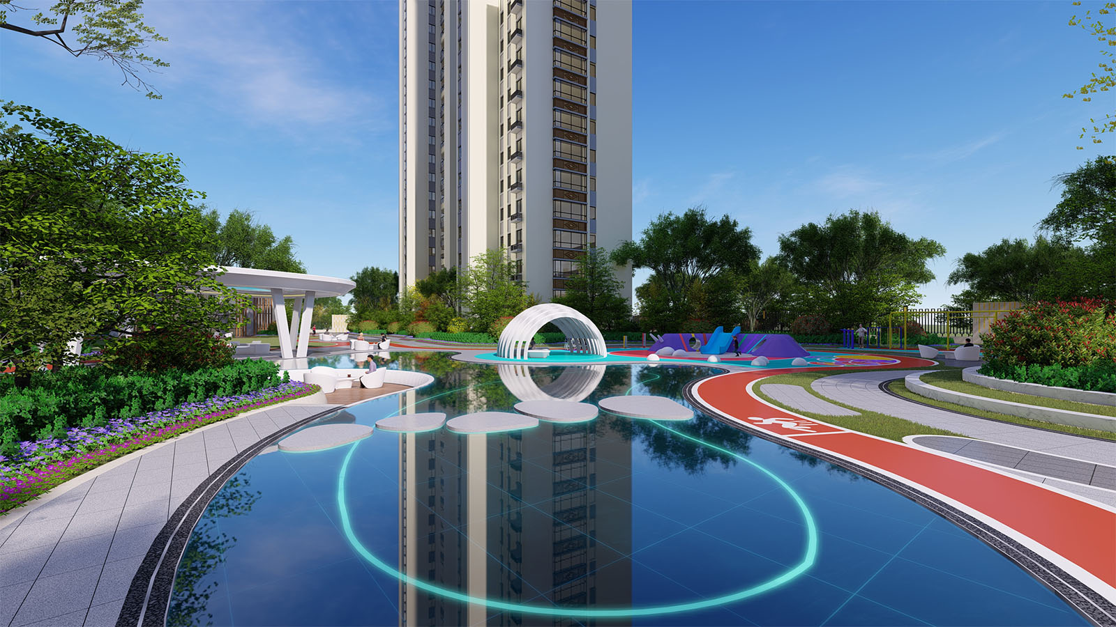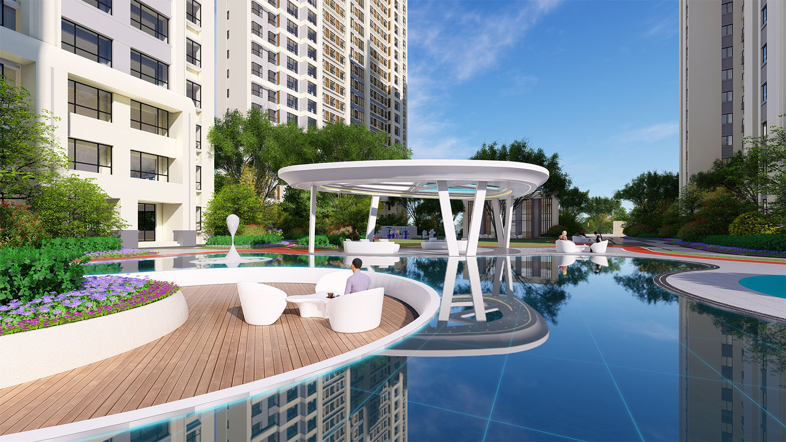 優(yōu)雅靈動(dòng)的線型、簡(jiǎn)潔純凈的色彩語(yǔ)言,富有韻律的構(gòu)圖和曲線形式,表達(dá)各生活功能區(qū)之間相互依纏的空間關(guān)系,線條柔和,以曲線構(gòu)成使的場(chǎng)地更具延展性,采用環(huán)繞式的手法體現(xiàn)出溫潤(rùn)與舒適的人居氛圍。