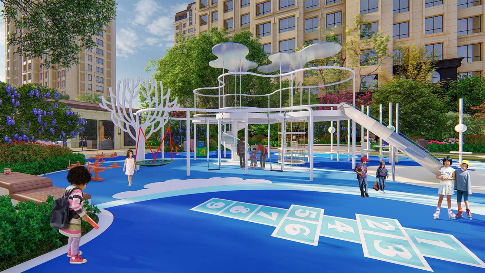 親子樂園景觀以“天空之城” 為設計主題,遨游于其中,感受不同成長階段的兒童樂趣并將之珍藏在記憶中,