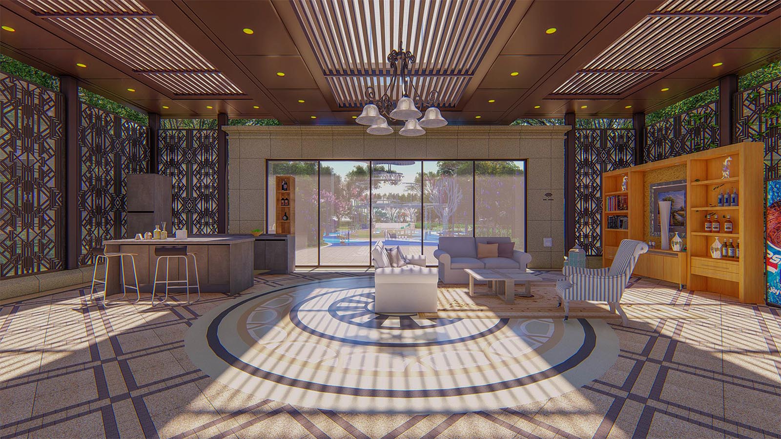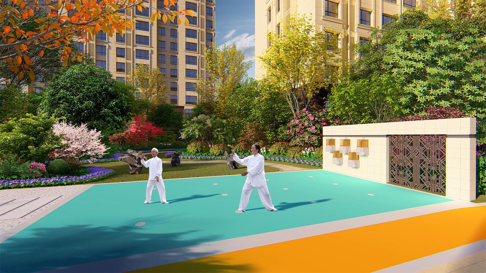 太極健身區設計太極點位,方便老人展開太極運動,通過對于臨邑當地生活習慣的深度調研,特別設計了棋牌娛樂空間,方便鄰里間在茶語飯后休閑時間,切磋棋牌游戲,