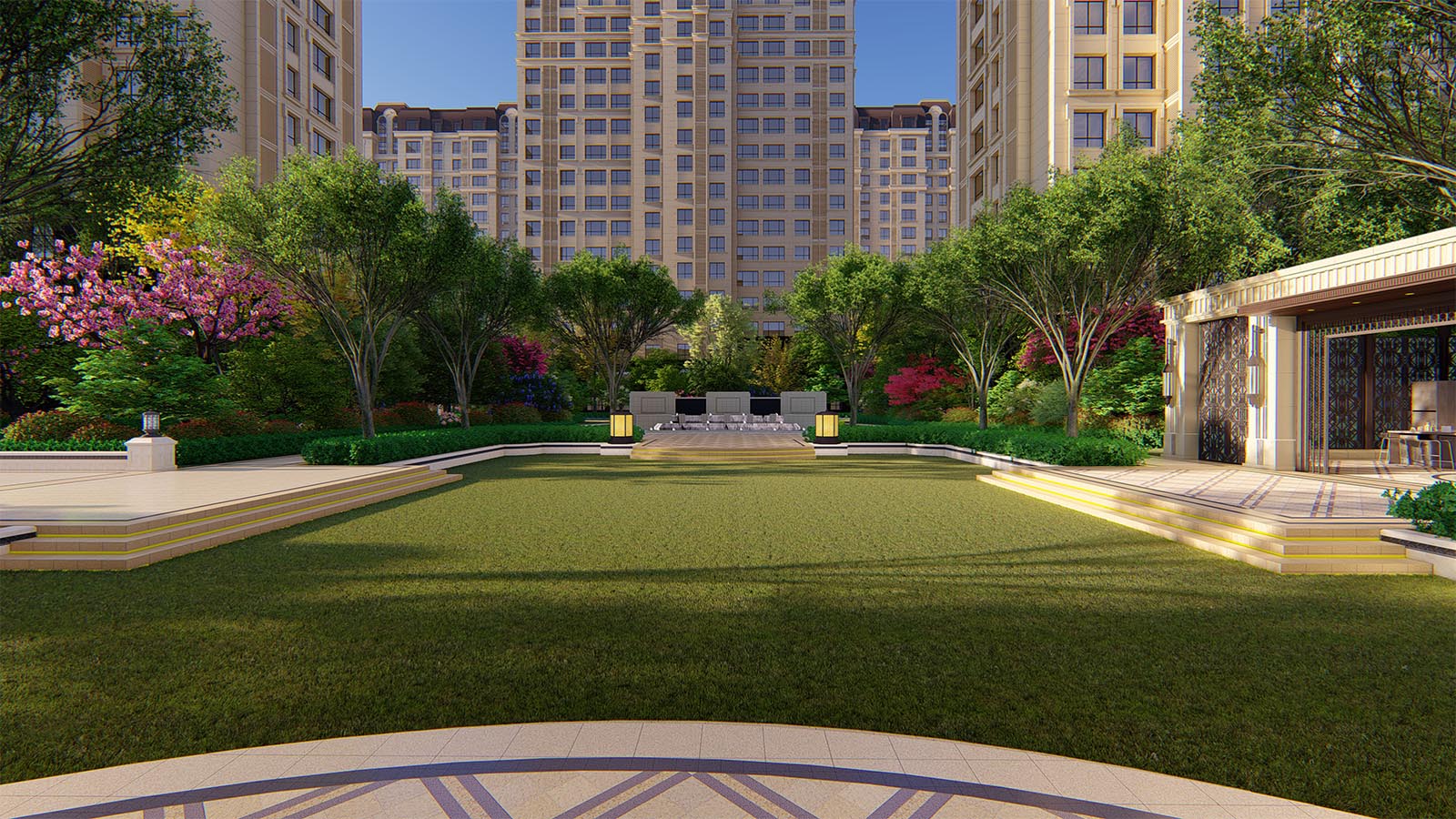 在地塊最中心的區域,設計提煉共享鄰里中心的概念,讓景觀不單單只是一個簡單的構架,而是為業主提供一個日用的生活場所。