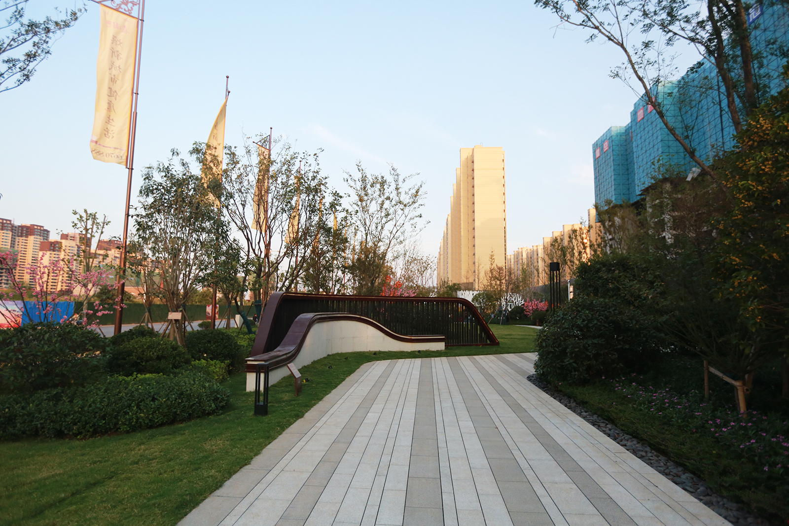 “百雀來迎” 景墻引導客戶進入示范區,示范區入口門頭與廊架相結合,金屬與石材完美契合,搭配浪漫花境自然優雅,大境盡攬。