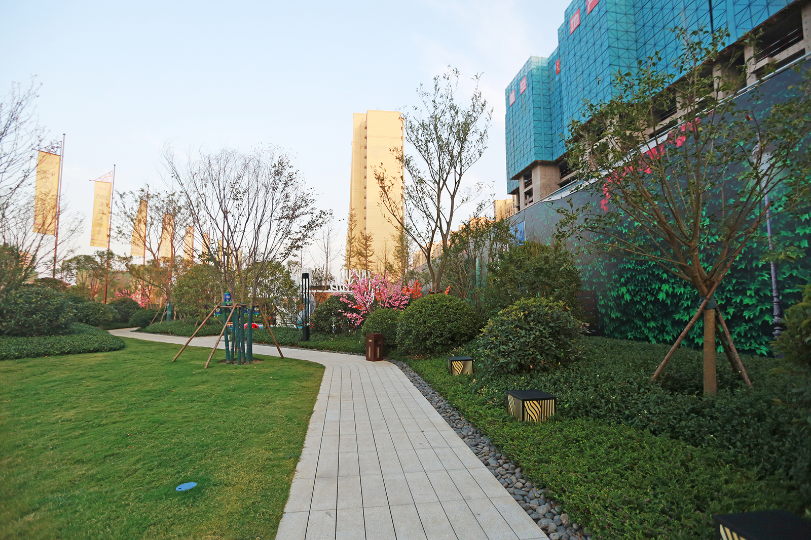 兒童樂園以親子同樂,喜鵲和鳴為意境,設置兒童體驗熱點,同時布置家長休閑看護區與洽談區,園路旁的喬木夾道種植,豐富的綠化層次,都能增強客戶對項目品質更加直觀的感受。