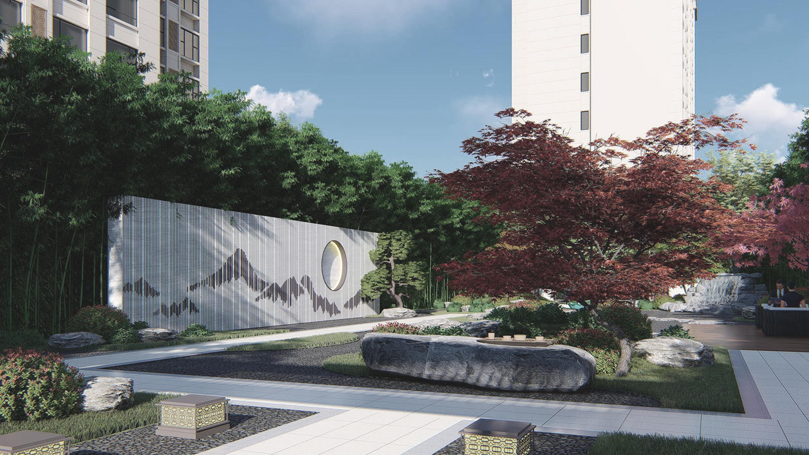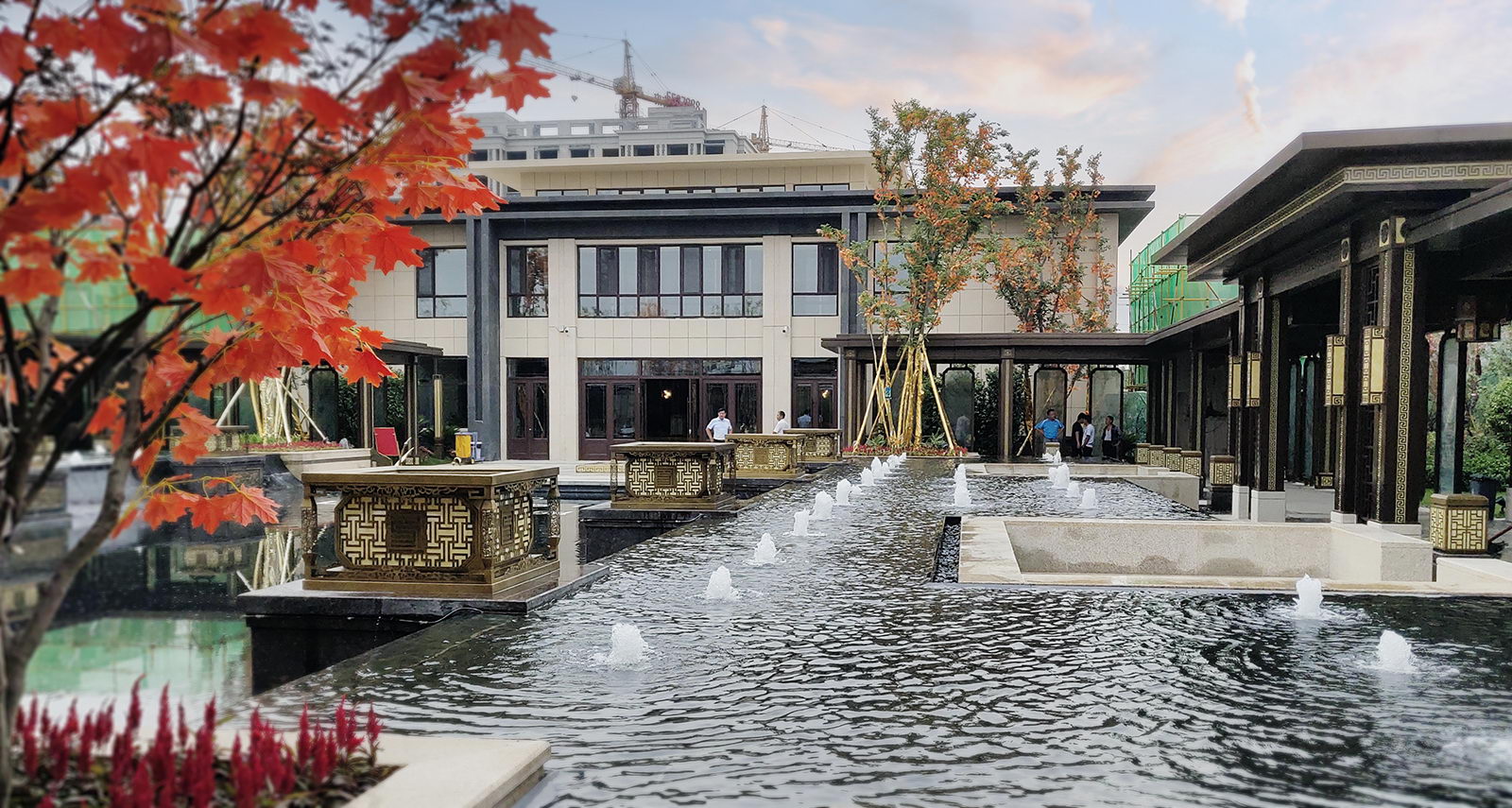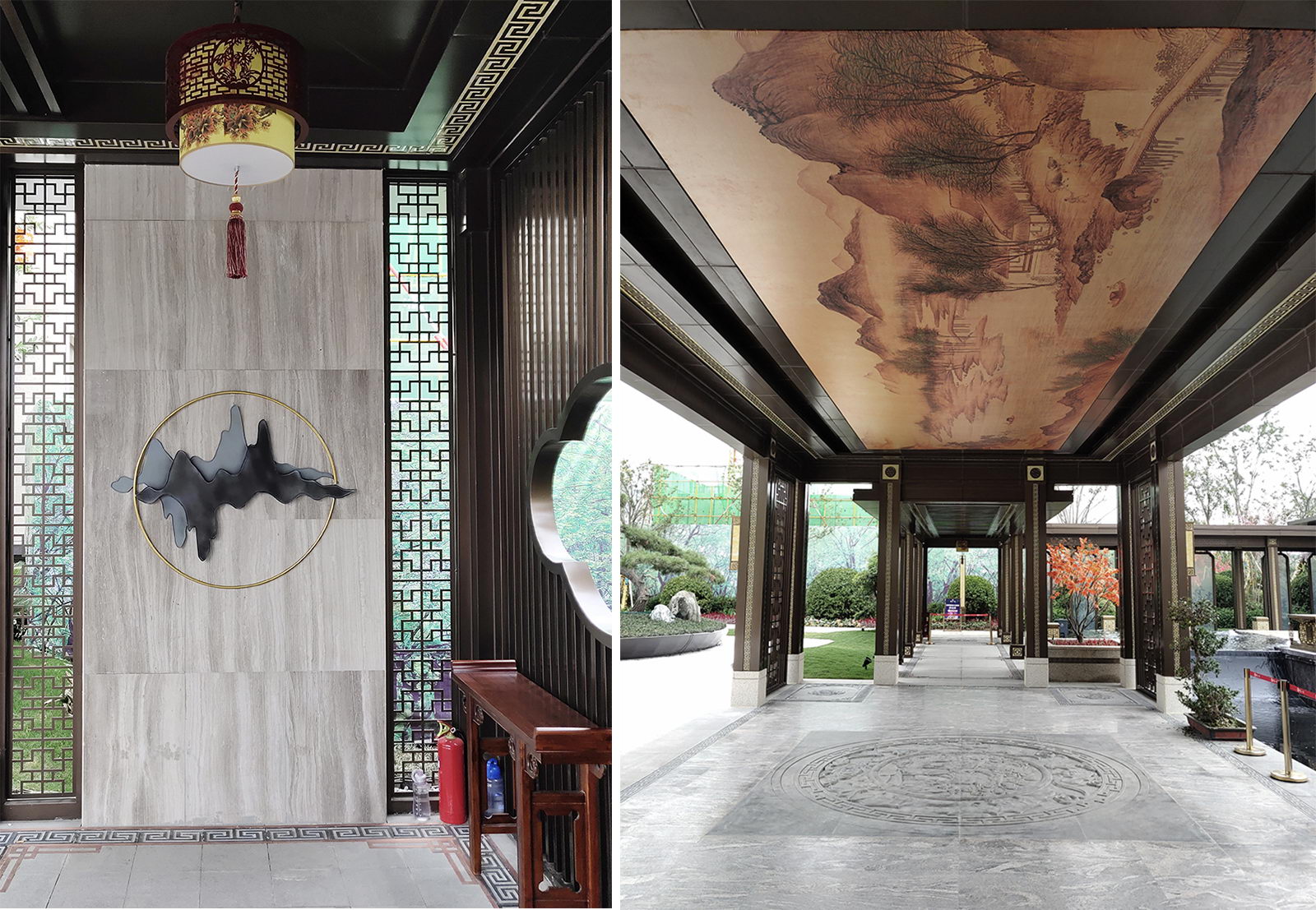 鏡面水景輕靈、優雅、致韻;雙排四座宮燈雕琢萬字符,寓意前程萬福。